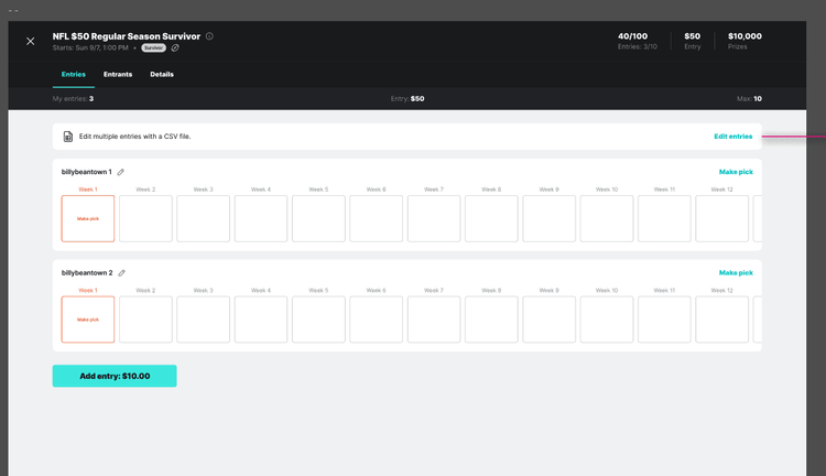 When you navigate to your entries in any contest where you have two or more entries, you'll now see a prominent banner prompting you to "edit multiple entries with a CSV file." This intelligent banner only appears when it's relevant—if you only have one entry, you won't see it cluttering your interface.