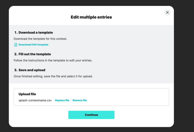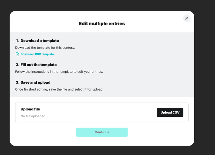 Tap "edit entries" and you'll open a comprehensive modal with clear, on-screen instructions. The most important step here is downloading the CSV template that's generated specifically for your contest entries.