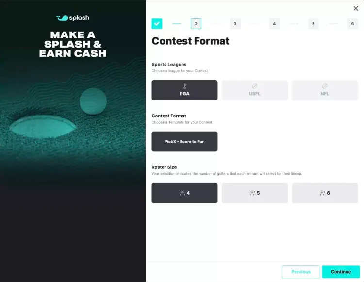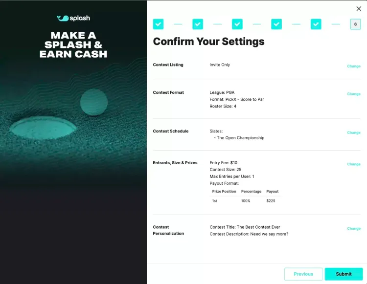 The Splash “create a contest” flow has been designed with efficiency and ease-of-use in mind. With only six quick steps, you’ll have your contest created and ready to invite up to 100 players in less than a minute.