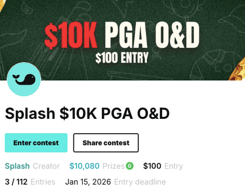 Splash $10K PGA O&D - A $100 entry contest offering $10,080 in guaranteed prizes, ideal for players wanting a season-long contest at a lighter entry fee. Top payouts include $3,024 for first, $2,016 for second, and $1,512 for third. Standard One & Done rules apply: one golfer per tournament, no repeats, and up to 3 entries per player.