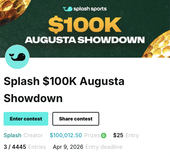 Another strong option is the Splash $100K Augusta Showdown, which features over $100,000 in total prizes and a deep payout structure that rewards performance across a wide portion of the field.