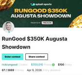 The RunGood $350K Augusta Showdown offers one of the largest tiers contest prize structures available, with more than $350,000 in total prizes and a $100 entry fee.