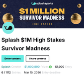Splash $1M High Stakes Survivor Madness - Designed for experienced competitors, this high-stakes contest brings together serious players competing for a seven-figure prize total.