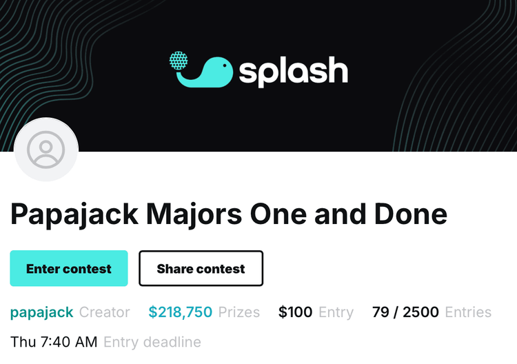Papajack Majors One and Done - A $100 entry contest featuring $218,750 in prizes, highlighted by $87,500 to 1st place. This is a majors-only format covering all four major championships (Masters, PGA Championship, U.S. Open, and The Open).