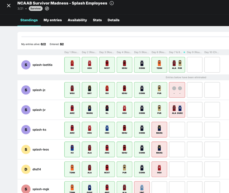At the end of the day, you’ll be able to see everyone’s pick and whether their entry survived.