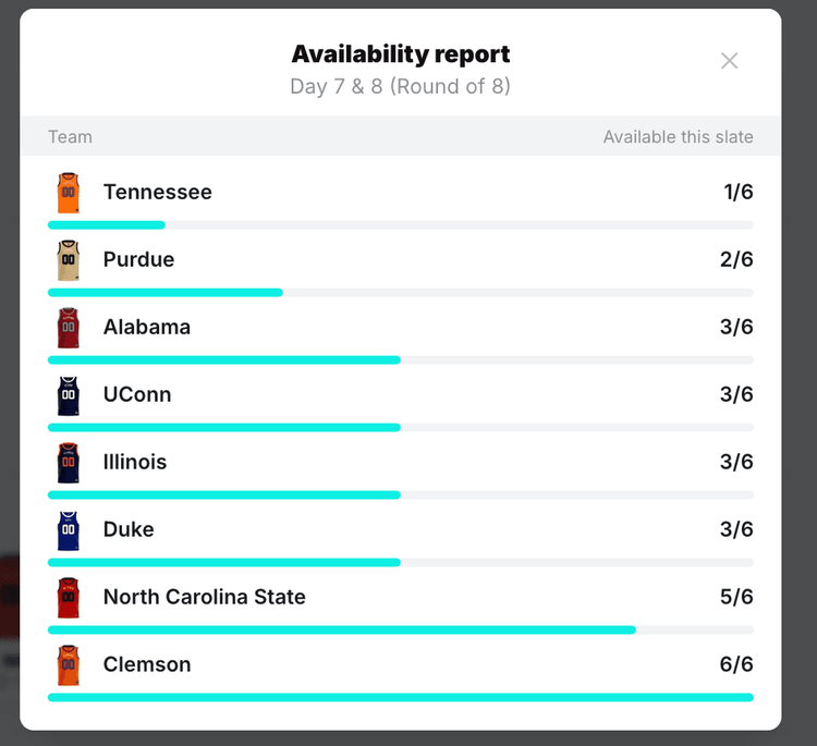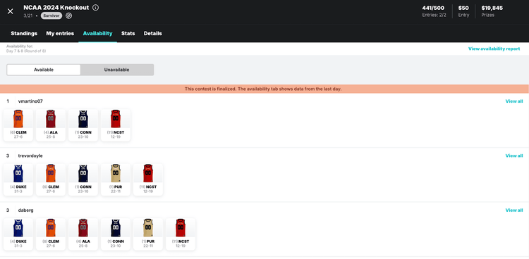 After the entry deadline, some of the other features will be revealed, mainly the Availability and Stats tabs. The availability tab has a report that is finalized at the end of each day and reveals which teams an entrant has left to pick and has already picked.