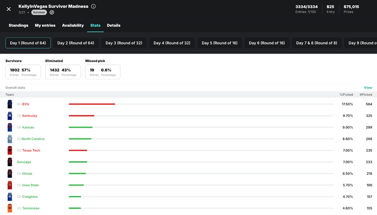 The stats tab will give a contest overview of the total number of entrants who survived, were eliminated and who missed a pick per slate. It will also show you the most popular teams picked per slate and how many entrants picked those teams on a percentage and total basis.