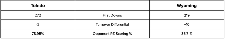 Toledo’s offense is the more productive of the squads by a fair margin - 52 first downs - but Wyoming’s turnover differential is much better. On the other hand, the Rockets are a bit better of a defense in the red zone and have more ‘quick strike’ ability when they have the ball. Should be a good game - Pick Toledo.