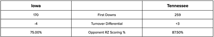 Iowa has the second fewest offensive first downs in the nation; by comparison, Tennessee converts a first down about 50% more often on offense, while also maintaining a better turnover differential. No surprise, Iowa’s defense is better at stiffening in the red zone. This was a weird game to make - Pick Tennessee.