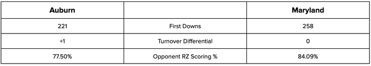 Neither team are offensive powerhouses but Maryland moves the chains more consistently (258 first downs to 221). Likewise, neither team makes much of an impact through turnover differential. The difference in this may just be in red zone defense, where Auburn has the season edge. It’s not enough - Pick Maryland.