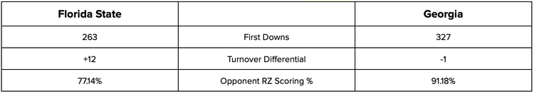 Florida State has weapons but the Seminoles are not the offensive juggernaut that the Bulldogs present on offense, with FSU producing first downs at a rate of four for every five Georgia converts. FSU is however much stronger on turnovers (+12) versus the suspect Bulldogs (-1). Georgia’s red zone defense is also substantially below average and almost 15% worse than FSU. Smells like upset - Pick Florida State.