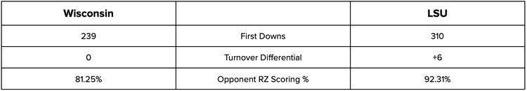 LSU is the far more productive offense of the two teams with about 70 more first downs on the season. LSU also has the superior turnover differential margin (+6). Neither team is strong in the red zone on defense; LSU allows points more often, but Wisconsin allows many more scoring opportunities. Blowout I think - Pick LSU.