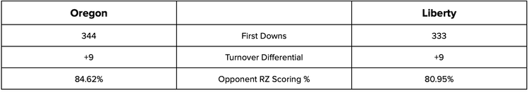 Oregon has more first downs than anyone in the country; Liberty is #2 in that category. The two teams also share an identical +9 turnover differential. Liberty is slightly more effective in red zone defense, but the Ducks have shown the ability to hang close in the fourth quarter. Fun game to watch - Pick Oregon.