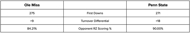Ole Miss is a fun, active team to watch on offense where they have a number of playmakers throughout the skill position to help keep the chains moving. Penn State is less glamorous but about as productive moving the sticks. Both of these teams are good at winning the turnover battle, but PSU is exceptional. Weirdly, neither team’s red zone defense is very good, Close one here - Pick Ole Miss.