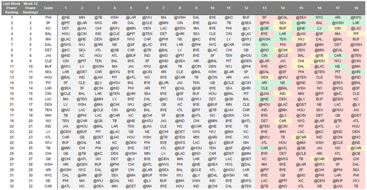 · Kansas City – After falling behind by 14 points early in their Week 12 matchup vs. the Raiders, the Kansas City Chiefs finally found a rhythm on offense outscoring the Raiders 31 – 3 the rest of the way and cruising to an easy victory. The most promising part of the Week 12 victory for the Chiefs was the emergence of rookie receiver Rashee Rice. If Patrick Mahomes can add a reliable second weapon behind Travis Kelce in the passing game the Chiefs may once again be the team to beat. In Week 13 the Chiefs travel to Green Bay for a Sunday Night Football game against the Green Bay Packers in Lambeau. Coming off a survivor-ruining defeat of the Lions on Thanksgiving last week the Packers suddenly find themselves in the wildcard conversation. With an easy schedule the rest of the way, the Packers still have a good chance to get in with a loss to the Chiefs on Sunday night. Of the five games remaining after the Packers, the Chiefs are not scheduled to play another team with a winning record. If the Chiefs remain on your available team list, save them for one of the upcoming games rather than on the road in a tough place to play.