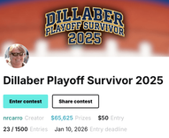 Dillaber Playoff Survivor 2025 — $50 entry, $65,625 in contest prizes, 1,500 entry max. A more traditional playoff Survivor format with a tighter field and higher entry point. This contest rewards clean execution from start to finish, with a double-pick Wild Card Weekend that immediately tests preparation and planning. Ideal for players who prefer a straightforward postseason Survivor experience with meaningful upside.