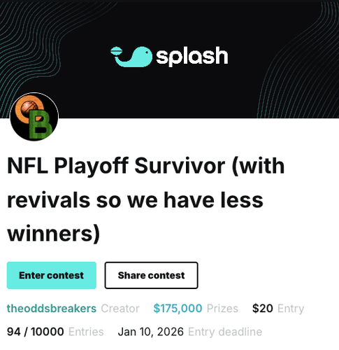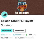 Splash $1M NFL Playoff Survivor — $150 entry, $1,000,080 in guaranteed contest prizes, 7,408 entry max.This is the marquee playoff Survivor contest on Splash Sports. Players must select three teams on Wild Card Weekend, two teams in the Divisional Round, and one team each in the Conference Championships and Super Bowl — with no team resets along the way. Every decision compounds, making this contest a true test of foresight, bracket awareness, and skill-based gameplay.
