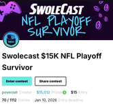 Swolecast $15K NFL Playoff Survivor — $15 entry, $15,012 in guaranteed contest prizes, 1,112 entry max.A more accessible entry point into playoff Survivor strategy, this contest mirrors the same multi-round structure as the larger contests while allowing players to sharpen their approach at a lower buy-in. Perfect for players who want to build multiple entries or experiment with different playoff paths without overextending a single strategy.