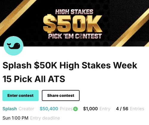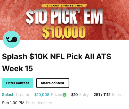 Splash $10K High Stakes Pick All ATS – A $10 entry contest featuring $10,008 in guaranteed prizes. Entrants make ATS selections for all 13 games on the slate and can lock in one “Best Pick” for double points. The top three finishers earn $1,271.17, $1,000.80, and $750.60 respectively. Single-entry only, for players ready for high-stakes competition.