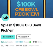 Splash $100K CFB Bowl Pick'em – A $100 entry contest featuring $100,080 in guaranteed prizes. Entrants make ATS selections for all 16 games on the slate and can lock in one “Best Pick” for double points. The top three finishers earn $12,710.16, $10,008.00, and $7,506.00 respectively. Single-entry only, for players ready for high-stakes competition.