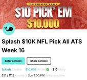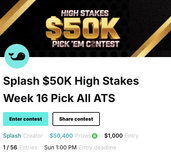 Splash $10K High Stakes Pick All ATS – A $10 entry contest featuring $10,008 in guaranteed prizes. Entrants make ATS selections for all 13 games on the slate and can lock in one “Best Pick” for double points. The top three finishers earn $1,271.17, $1,000.80, and $750.60 respectively. Single-entry only, for players ready for high-stakes competition.