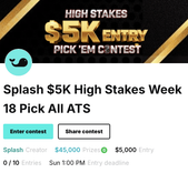 Splash $5K NFL Pick All ATS – A $5,000 entry contest with $45,000 in guaranteed contest prizes. Players pick every game against the spread from Saturday through Sunday Night Football, earning one point per correct selection and double points for a “Best Pick.” The top finisher takes home the entire payout of.
