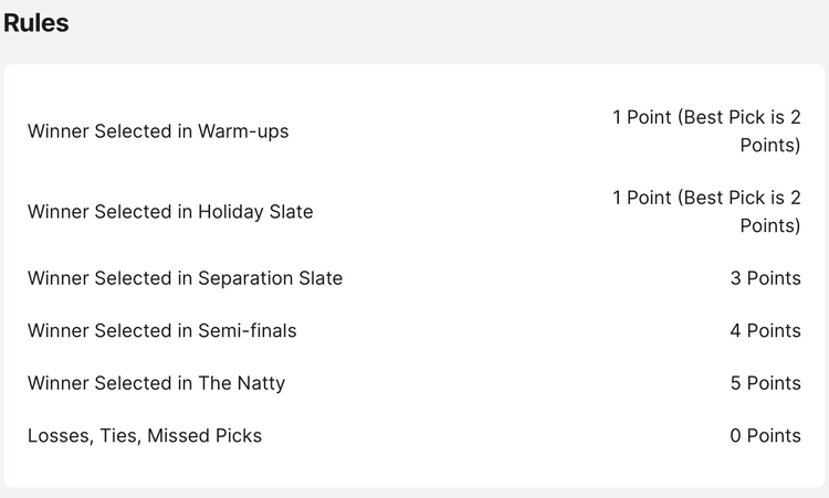 Our group of college football fanatics over at Splash have spent weeks crafting the perfect formula of settings for our Bowl Bonanza, and we believe it’s got a bit of everything. For this contest, you’ll be put to the test, picking 17 games from each of our five designated slates (note that if there are less than 17 games in a slate, you’ll be required to pick all of them). Picking the winners of the “Warm-up” and “Holiday” slate will net you 1 point for each correct pick, and you’ll also be able to designate a Best Pick for each of those slates that is worth two points if you get it right. The “Separation” slate is worth 3 points for each correct pick, the “Semi-finals” slate is worth 4 points, and “The Natty” (no, legally we can’t say the real thing), is worth 5 points.