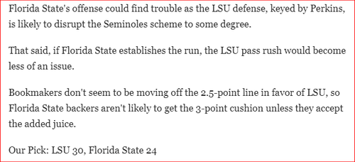 Deadspin picked LSU straight up and piled on, picking them ATS by six. Splash users were a whole bunch smarter, picking Florida State by +2.5, while the Seminoles went on to win by a score of 45-24.
