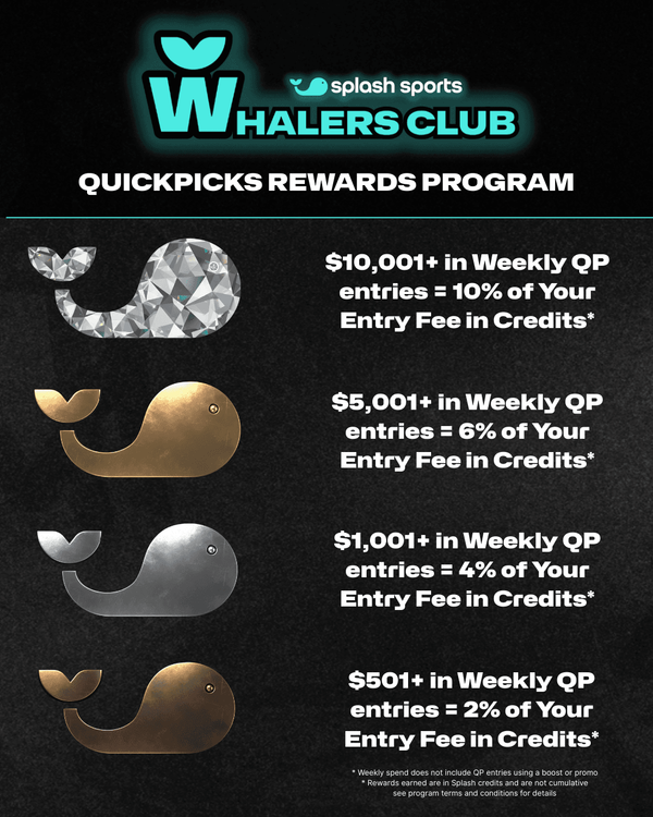 The Whalers Club program runs every week from Thursday at 12:00 AM EST through Wednesday at 11:59 PM EST. Your tier is determined by your total QuickPicks entry fees during that week, and Splash Credits are automatically deposited to your account the following Friday.