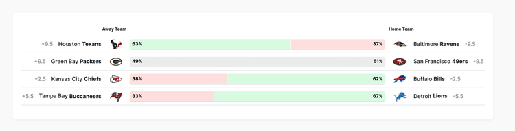 The reaction from Splash users to Baltimore being favored by 9.5 points is interesting. Only 37 percent of Splash pickers against the spread think the Ravens will cover, making Baltimore the only favorite this week to receive a minority of the support in its matchup. That is quite a big line given how good the Texans have been lately, and it resulted in 63 percent of Splash users wanting the dog. That makes it tough to tell exactly who Splash pickers have penciled into the next round. Maybe that means we’re in for a good one.